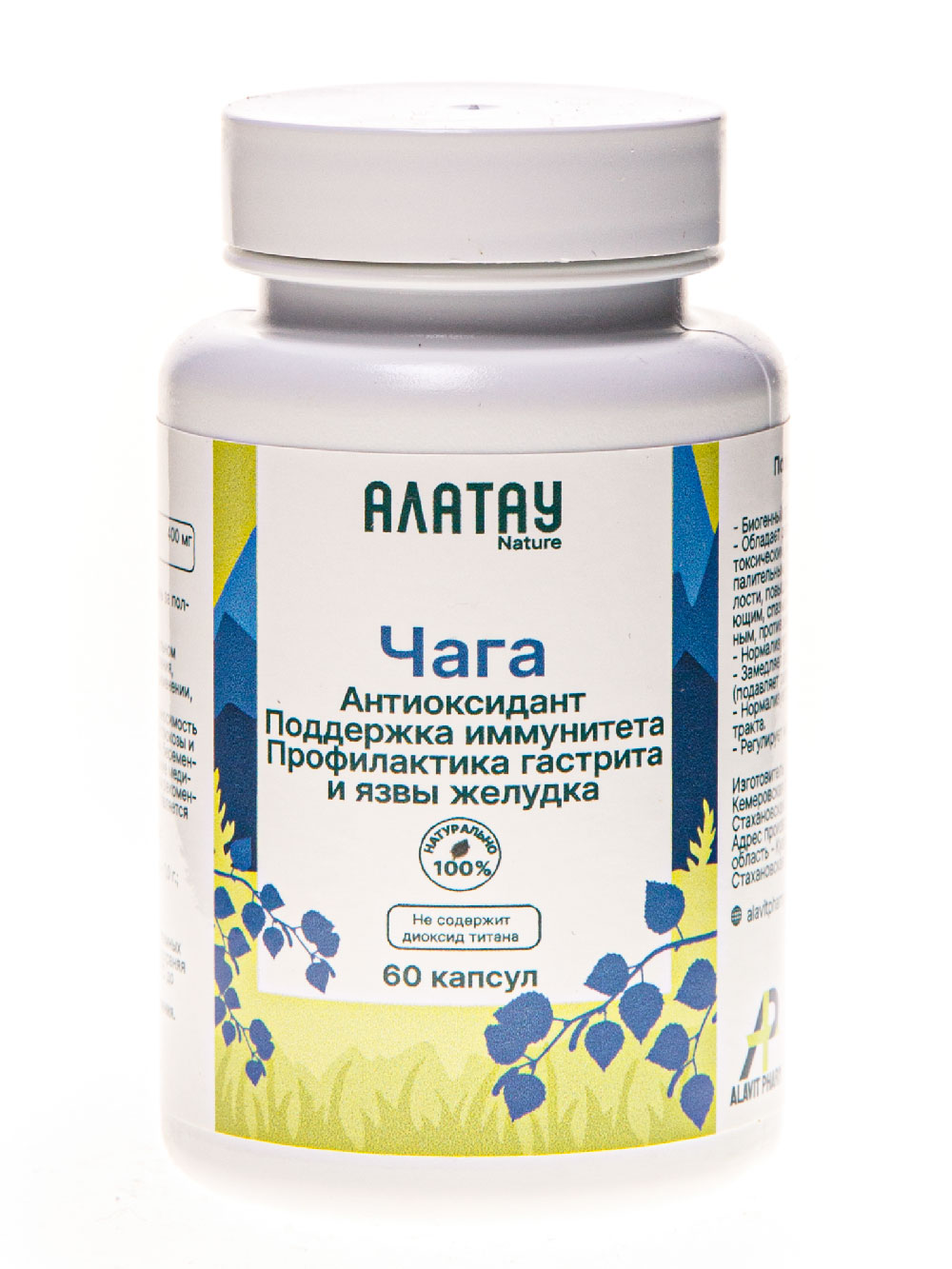 Содержание в 1 капсуле: стандартизированный экстракт чага (гриб), 300 мг, сумма хромогенного комплекса 40%, мальтодекстрин 100 мг.