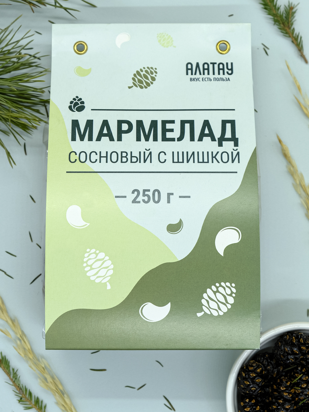 Сахар, отвар сосновый (вода, молодая сосновая шишка), патока, пектин, лимонная кислота, глянцеватель (раст.масло, пчелиный воск)
