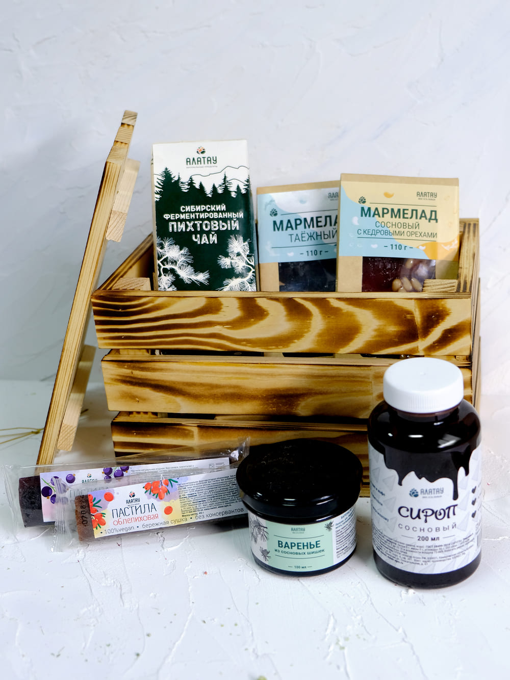 Мармелад сосновый с кедровыми орехами, 110 гр - 1 шт. Мармелад Таежный, 110 гр - 1 шт. Сироп сосновый 200 мл - 1 шт. Чай пихтовый ферментированный (20 пакетиков) - 1 шт. Варенье сосновое, 100 мл - 1 шт. Пастила облепиховая, 45 гр - 1 шт. Пастила смородиновая, 45 гр - 1 шт. |