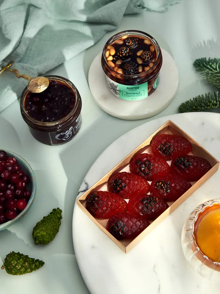 - Варенье из сосновых шишек с кедровыми орехами (100 мл). Состав: молодые сосновые шишки, кедровые орехи, сахар, вода.